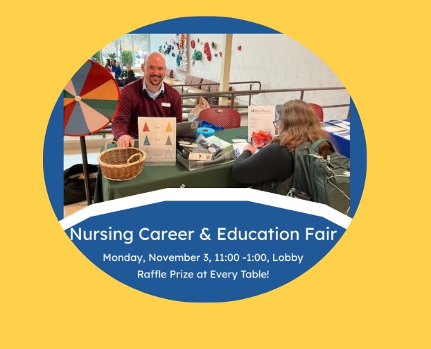 Don’t miss the Nursing Career & Education Fair Monday, 11/3, 11:00 – 1:00 in the Lobby! Enter to win a raffle prize at each table! Questions? Contact [email protected]